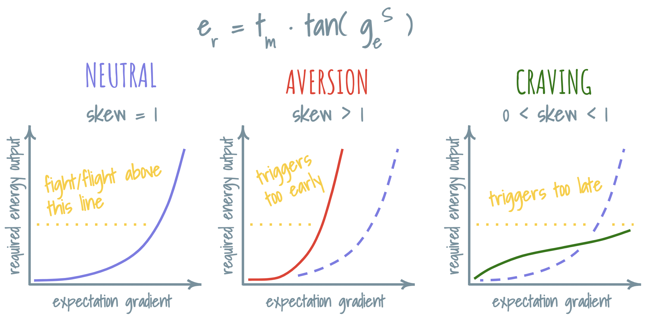 To capture this bending in one variable, I am going to reach for an exponent. Let’s call it the gradient skew. Then, the clean diagonal line is the skew exponent that equals to one. The skew that is larger than one will express an aversion, and skew between one and zero will express a craving.